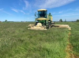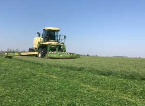 Het maaien doen wij met onze 2 Krone big-M maaiers met een werk breedte van 10 meter. bovendien kneusen deze maaiers het gras intensief waardoor het sneller droogt. daarnaast beschikt de maaier ook over vijzels achter het maaidek zo kunnen wij in droge periodes meteen het gras op swadleggen hierdoor is er minimaal verlies van het product.