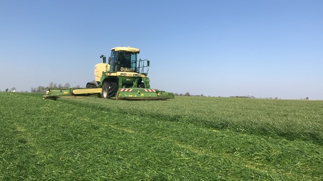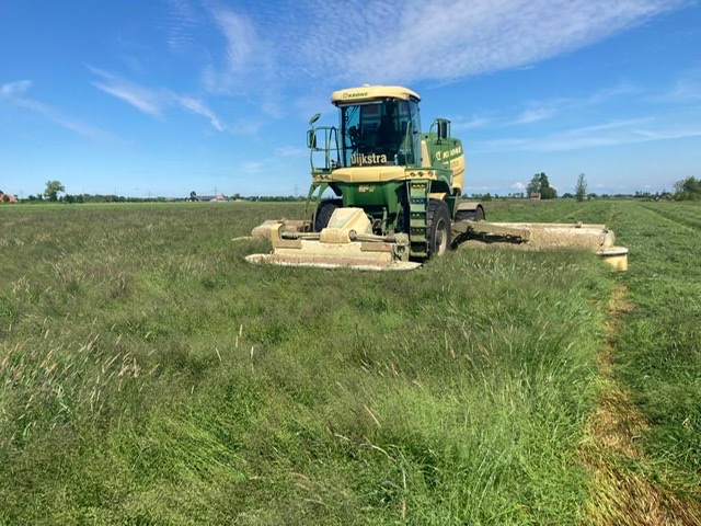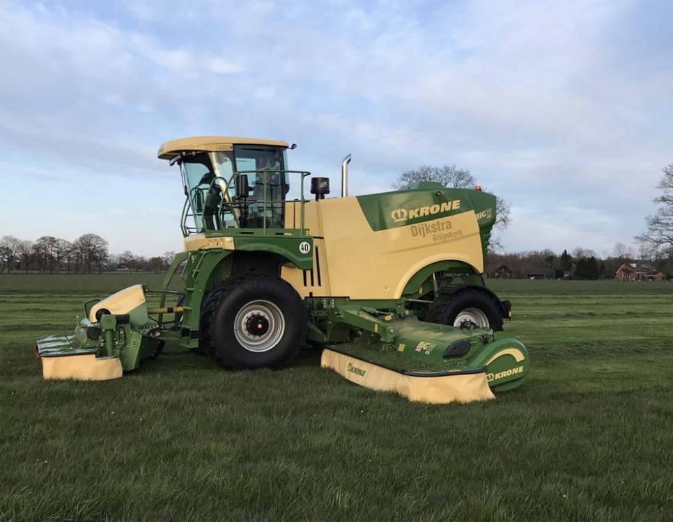 Het maaien doen wij met onze 2 Krone big-M maaiers met een werk breedte van 10 meter. bovendien kneusen deze maaiers het gras intensief waardoor het sneller droogt. daarnaast beschikt de maaier ook over vijzels achter het maaidek zo kunnen wij in droge periodes meteen het gras op swadleggen hierdoor is er minimaal verlies van het product.